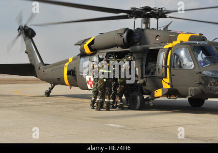 Mitglieder Der 51 Medizinischen Feld Gruppe Response Team Und Ein Soldat Aus Dem 3 Allgemeine Unterstutzung Aviation Battalion Der Us Armee Garnison Humphreys Der Republik Korea Ein Mock Unfall Von Einem Black Hawk